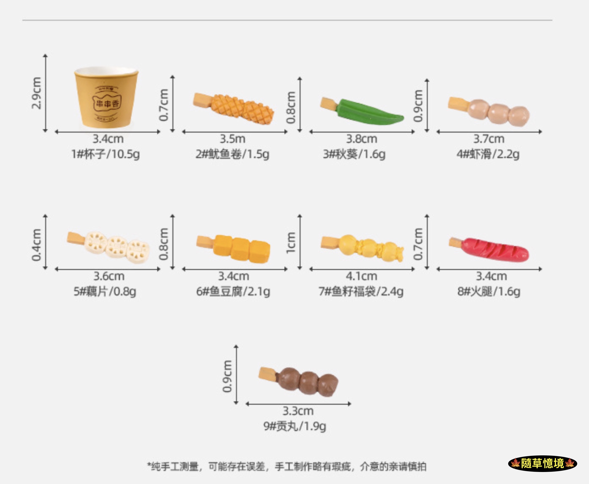 (9款)迷你仿真 關東煮 串燒 熱狗 貢丸 魚丸 秋葵 魷魚卷 黑輪 藕片 娃娃屋 袖珍 微縮 食玩 微景觀 模型