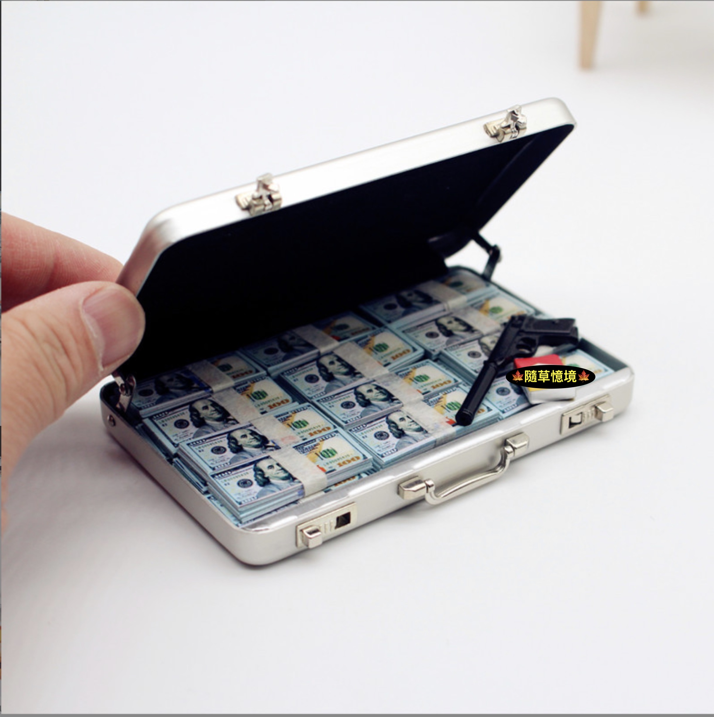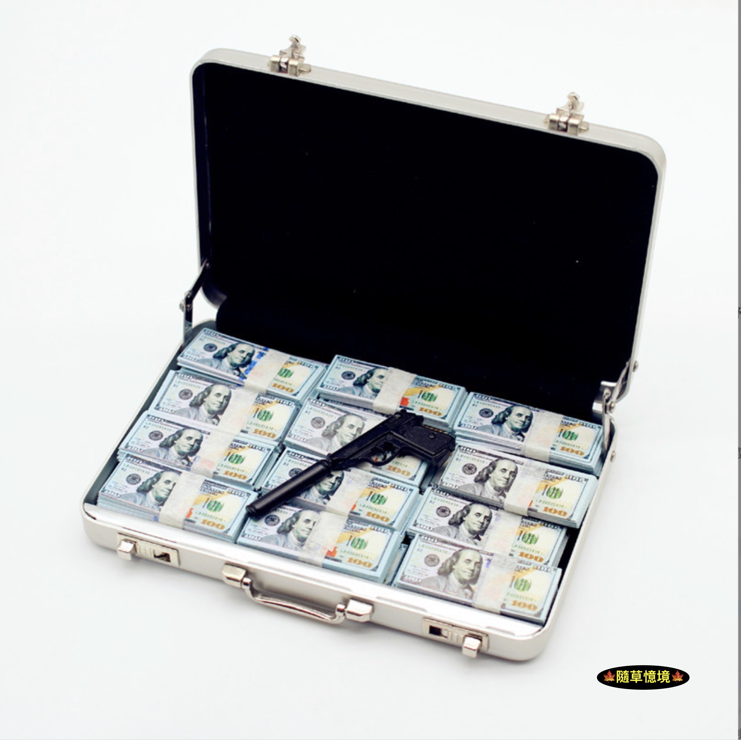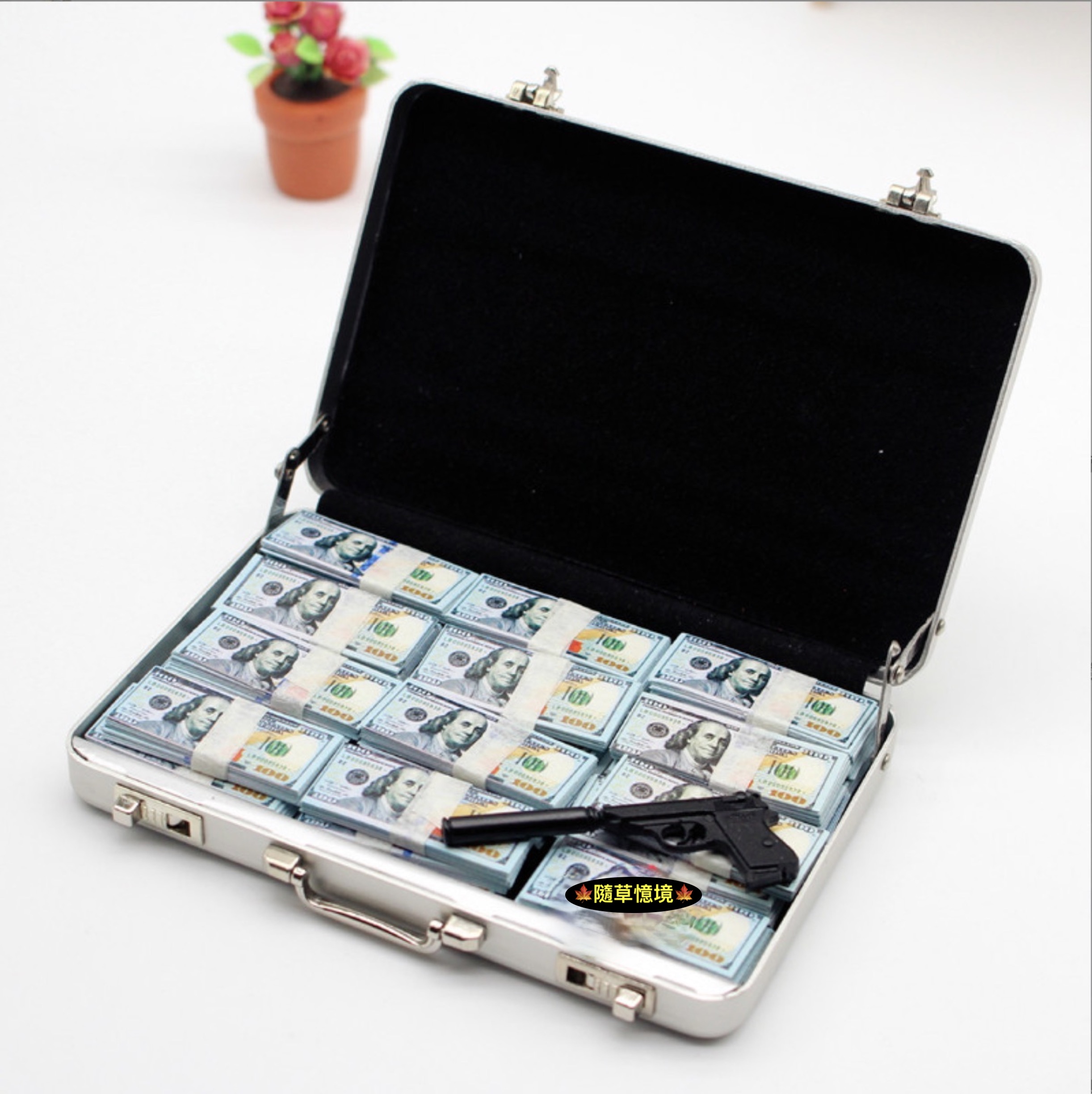 🍁🍁🍁【包 裝】 包含行李箱X1(雙扣開關)、 美鈔X36疊(每疊約20張左右,獨立雙面彩印)、合金 仿真手槍X1(含消音管) 總重量 80g