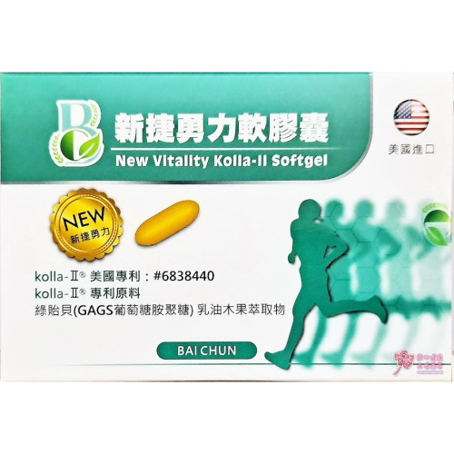 品牌 : 捷勇力 產品名稱 : 新捷勇力軟膠囊食品(60粒/盒) 容量/規格:60粒/盒 成分 : 葡萄糖胺鹽酸鹽500毫克、軟骨素硫酸鹽、MSM、貓爪藤萃取、薑黃萃取、kolla-ll二型膠原蛋白、綠飴貝萃取物、乳油木果萃取 營養標示 : 如圖所示 用法 : 一天一顆 產地:台灣 貨源:公司貨 效期 : 2年內