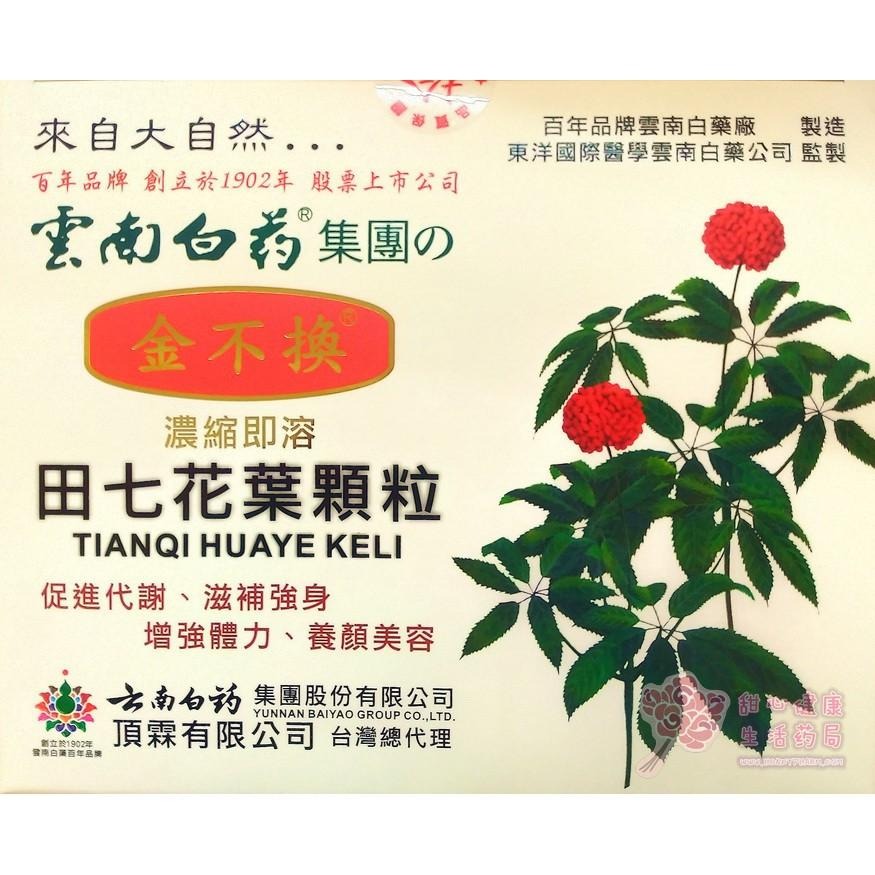 品牌 : 雲南白藥 產品名稱 : 田七花顆粒(6盒裝,60包) 容量/規格:60包/盒 成分 : 三七花、葉、蔗糖 營養標示 : 如圖所示 用法 : 一次一包沖泡,用沸水或冷水300-600CC,一日1-3次 產地:台灣 貨源:公司貨 效期 : 2年內