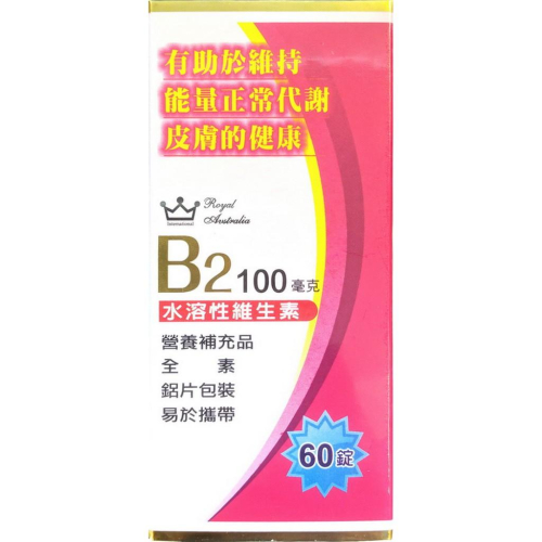 品牌 : 中日 產品名稱 : 皇家維他命B2錠100毫克(60錠/盒) 容量/規格:60粒/盒 成分 : 維生素B2 營養標示 : 如圖所示 用法 : 一日一錠 產地:台灣 貨源:公司貨 效期 : 2年內