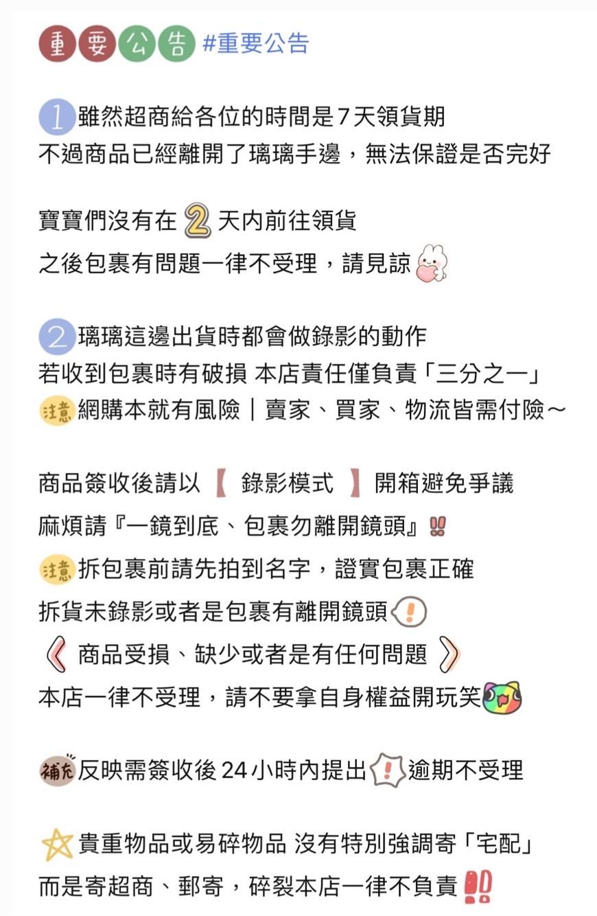 <p>為確保雙方權益</p><p><b><font color="#000000" style="background-color:rgb(255,255,0)&#59;">《拆貨時請全程錄影》</font></b></p><p>並且<span style="background-color:rgb(0,255,255)&#59;"><b>『一開始要先錄到外包裝是本人名字』</b></span></p><p><b><font style="background-color:rgb(255,0,0)&#59;" color="#f7f7f7">錄影時拆封包裹請一鏡到底!</font></b></p><p>若無錄影或中斷,全部不負責不履行!</p><p><br /></p><p>貴重物品或易碎物</p><p>沒有特別強調寄「宅配」</p><p>而是寄超商、郵寄</p><p>碎裂本店一律不負責❤️</p><p><br /></p><p>本店在包貨、寄貨時</p><p>皆會錄影證實寄出的包裹無誤及沒有破碎</p><p>若收到包裹時有破損</p><p><span style="background-color:rgb(255,255,0)&#59;"><b>本店責任僅負責「三分之一」</b></span></p><p><br /></p><p>⚠️網購本就有風險</p><p>賣家、買家、物流皆需付險~</p><p>若不能接受本店規定!勿下單!</p><p><b style="background-color:rgb(0,255,255)&#59;">下單視為認同本店規定</b></p>