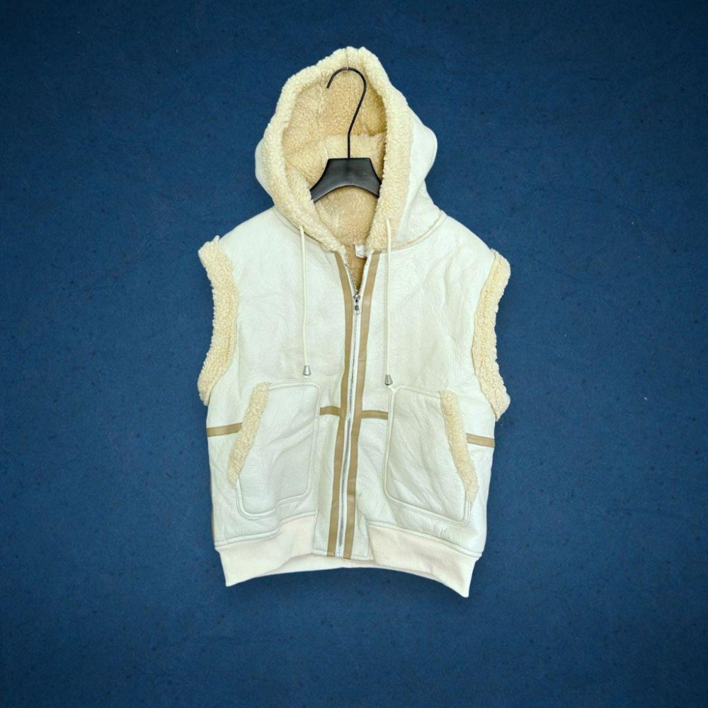 二手 JH 米白 九成七新大碼可 PU皮內膽爆毛保暖版型挺連帽前拉鍊雙口袋F碼 無袖 背心 VA1202﹝凡賽蘇﹞