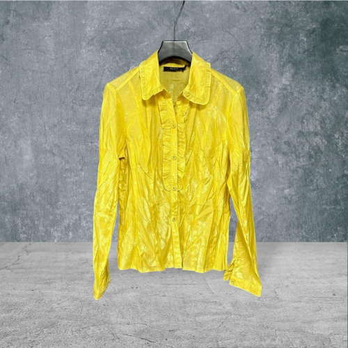 二手 KUDA 薑黃 九成五新 光澤聚脂纖維荷葉邊包扣輕薄L號 長袖 襯衫 VA1105﹝凡賽蘇﹞