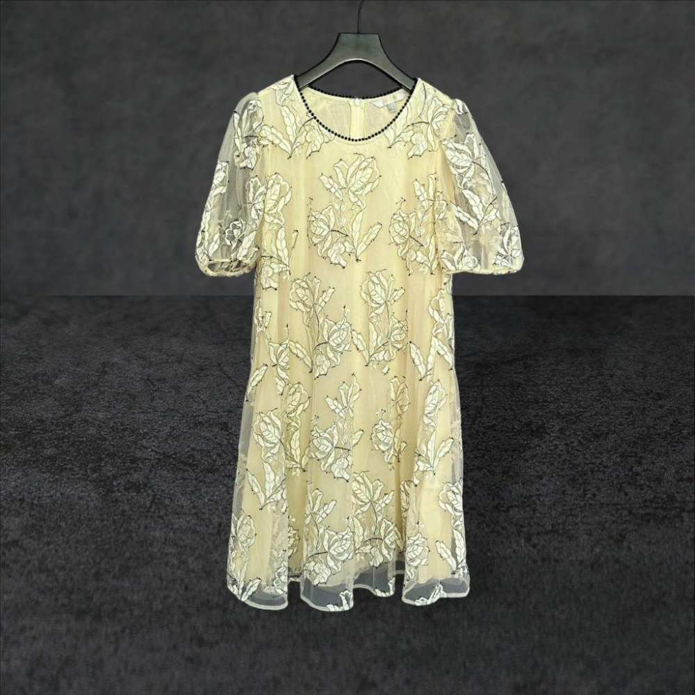 二手 蔡佳瑾設計師 米 九成五新 網紗蕾絲花蓬袖微透膚A字連身裙S號 短袖 洋裝 VA1025﹝凡賽蘇﹞