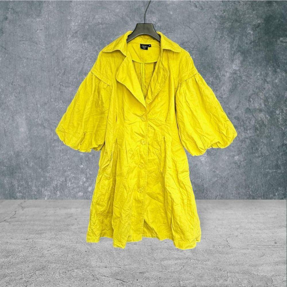二手 IROO 芥末黃 九成新大碼可 棉麻落肩七分燈籠袖雙口袋連身裙風衣40號 大衣 外套 VA1016﹝凡賽蘇﹞