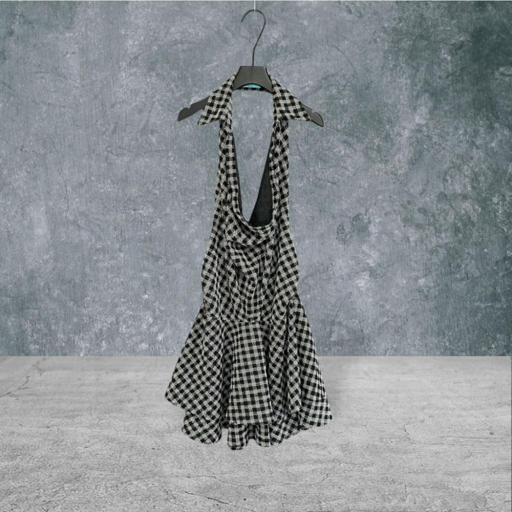 二手 étoile 黑白 九成五新 彈性棉麻毛呢千鳥格繞頸美背V領垂墜蓬裙 無袖 洋裝 VA910﹝凡賽蘇﹞