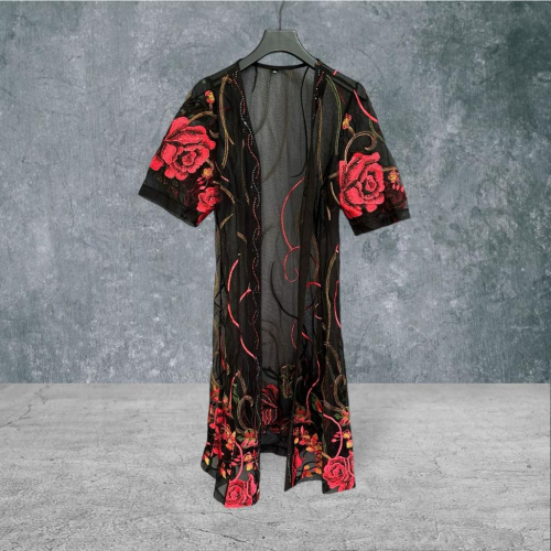 二手 黑紅 大碼可 網紗刺繡花三色線藤蔓水鑽長版開襟罩衫2XL 短袖 上衣 VA903﹝凡賽蘇﹞