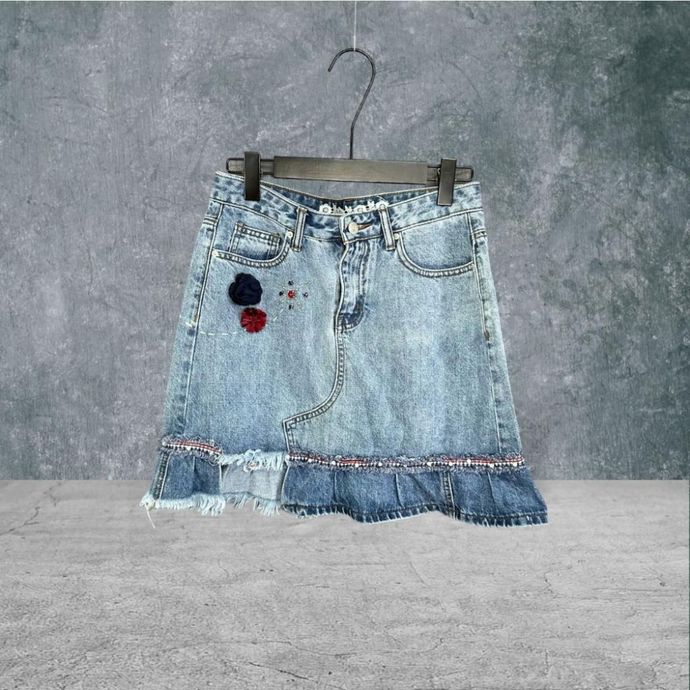 二手 LASHION歐洲品牌 藍 九成五新 版型挺立體布花水鑽珍珠鬚邊不規則裙襬 牛仔 短裙 VA902﹝凡賽蘇﹞
