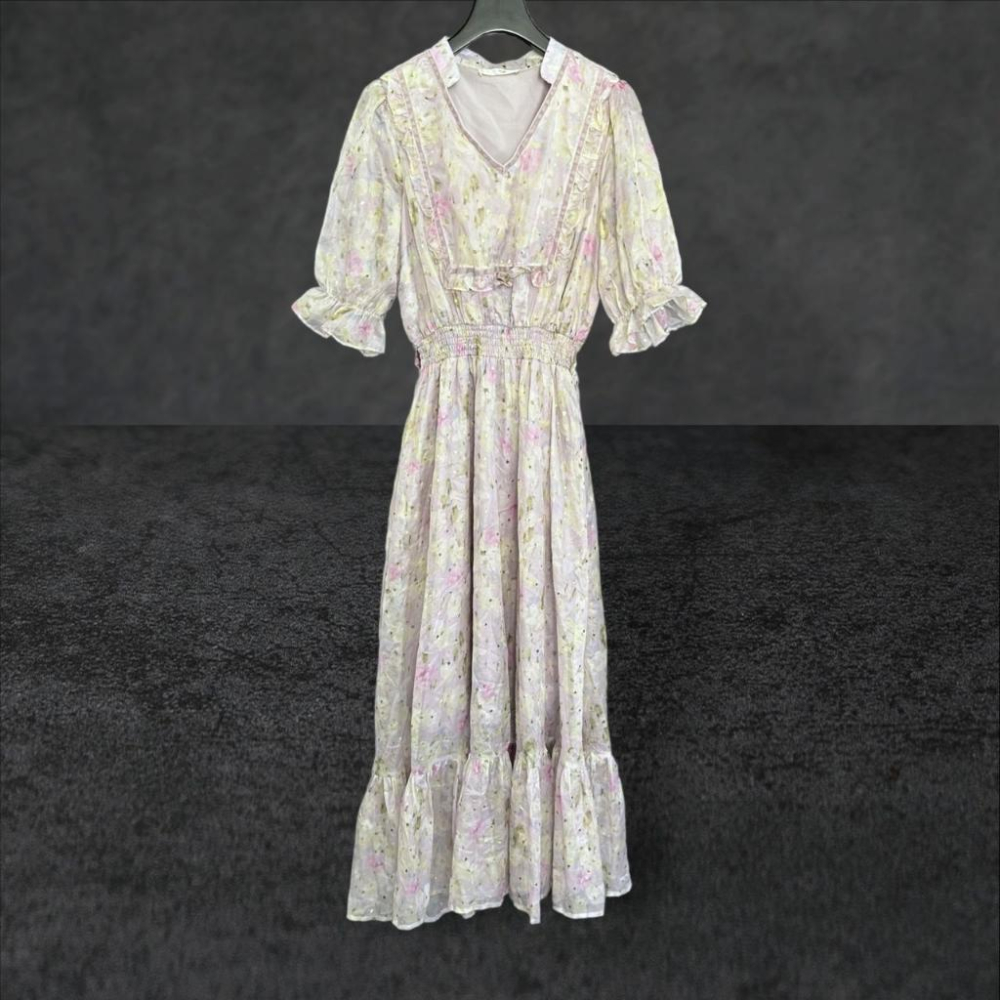 二手 POOKY 粉紫 夢幻超仙 雪紡水彩花紋燙金愛心V領飄逸裙襬 短袖 洋裝 VA27 ﹝凡賽蘇﹞