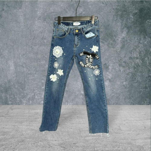 二手 DAMIA 韓國製 藍 刺繡花蕾絲珍珠水鑽彈性直筒顯瘦M號 牛仔 長褲 VA727﹝凡賽蘇﹞