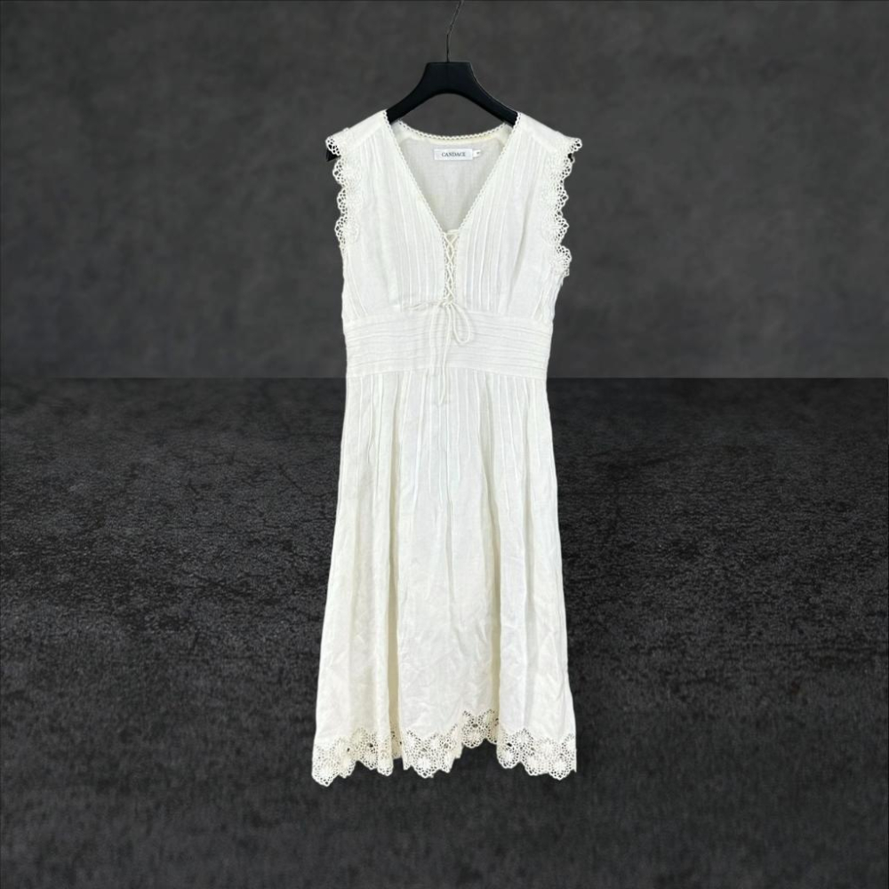 二手 CANDACE洪秀女 白 棉麻壓褶V領綁繩刺繡蕾絲邊9號 無袖 洋裝 VA727﹝凡賽蘇﹞