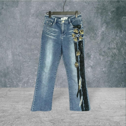 二手 ELEWIN 藍 復古刷色蕾絲牛仔花金粉彈性小喇叭11號 牛仔 長褲 VA719 ﹝凡賽蘇﹞