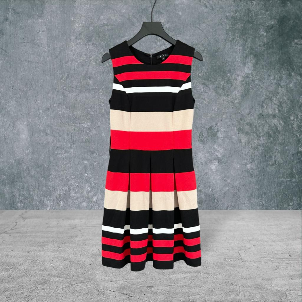 二手 XING 紅黑 高質感棉質復古美式條紋蓬裙 法式溫柔赫本風夏日海灘渡假 無袖洋裝 VA512 ﹝凡賽蘇﹞
