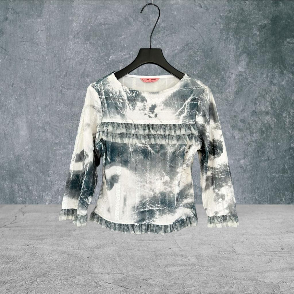 二手 vimvim 灰白 水墨花色縫珠銀線網紗蕾絲木耳邊 彈性七分袖 上衣 VA505 ﹝凡賽蘇﹞
