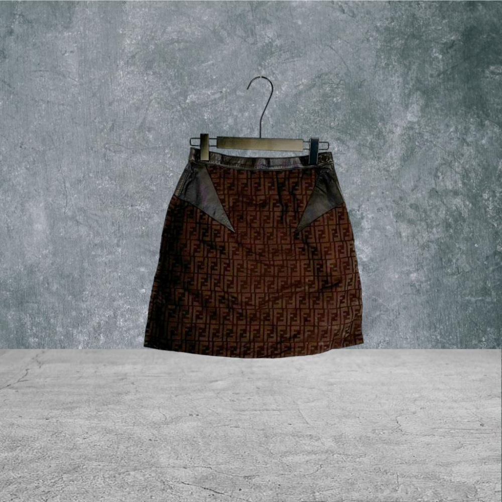 二手 義大利製 FENDI 咖啡色 類帆布 略硬挺 拼接 真皮 高腰 27 短裙 VAE1226 ﹝凡賽蘇﹞