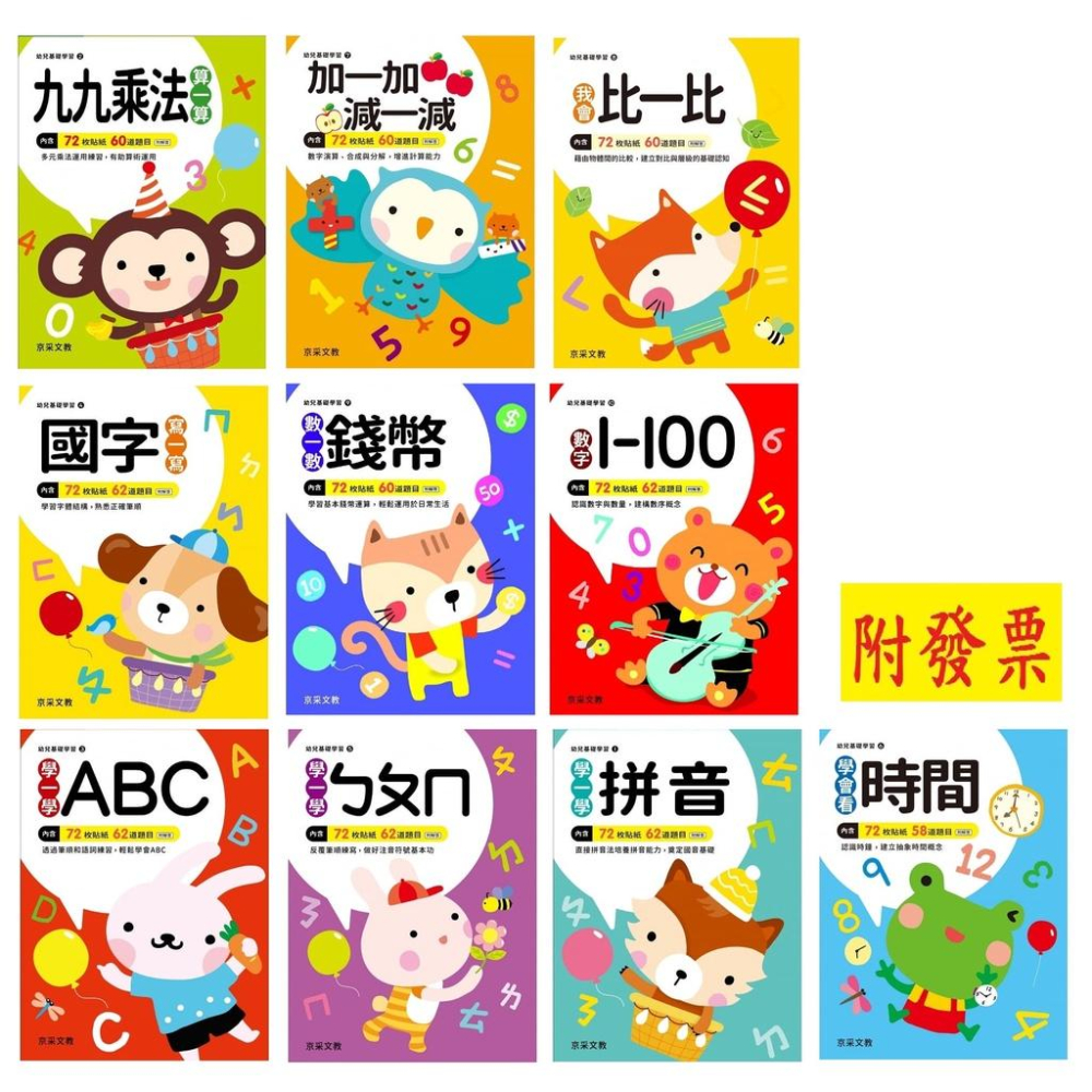 詳細資料 ISBN:4719742171423 規格:平裝 / 64頁 / 21 x 28.2 x 1 cm / 普通級 / 全彩印刷 / 初版 出版地:台灣 適讀年齡:3歲~6歲 <數字1~100>   本書根據幼兒能力發展設計,以漸進、無壓力的方式教導孩子認識數字1~100並學習數的點算、了解數與量的關係、數序的概念以及數字的練寫。幫助孩子從閱、練寫的過程中奠定良好的數學基礎。 <九九乘法算一算>   本系列教導基本的九九乘法,配合簡單的應用題,內容設計實用又靈活多變,符合孩子的能力與需求,是學前練習的最佳學習工具。 <我會比一比> 本書教導幼兒關於比一比的概念,從比長短、高矮、多寡,內容實用又多變,讓孩子在學習比一比的過程中不會乏味,更能夠奠定良好的數學基礎。另附有一大張獎勵貼紙。 <加一加.減一減> 本書是依據幼兒能力發展設計,由圖示演算漸進到數字演算、由合成、分解概念進而到加、減的練習題,此外並加強10以內的加、減法,以增進孩子的書寫算式能力,讓孩子在學習加減運算的過程中奠定良好的數學基礎。 <學會看時間> 本書以清楚的時鐘圖案解說,幫助孩子建立抽象的時間概念,包括時鐘、時針、分針、秒針、整點、半點、幾分鐘和電子鐘等學習內容,搭配活潑有趣的圖案及練習題,讓孩子輕鬆建立時間的概念。 <學一學ㄅㄆㄇ> 本書以37個注音符號為學習主軸。內容有ㄅ到ㄦ的筆順練習和相關的語詞發音練習和相關的語詞發音練習,並附有色彩鮮明、清晰的實物圖片及趣味遊戲。讓孩子從練寫、遊戲的過程中,輕鬆學會ㄅㄆㄇ。 <國字寫一寫>  本書是以孩子生活常見的國字及語詞為主軸,達到學習與生活相結合的目的。書中附十字線的練習格亦符合教育部規定,以利孩子學習字體結構。此外,趣味的評量式文字遊戲,能讓孩子從練寫的過程中領略文字的優美並建立良好的語文基礎。 <學一學ABC> 本書以26個英文字母為學習主軸。內容有A到Z的筆順練習和相關的語詞練習,並附有色彩鮮明、清晰的圖片及趣味遊戲。讓孩子從練寫、遊戲的過程中,輕鬆學會ABC。 <九九乘法算一算> 本系列教導基本的九九乘法,配合簡單的應用題,內容設計實用又靈活多變,符合孩子的能力與需求,是學前練習的最佳學習工具。 <學一學拼音> 本書內容包括一句兒歌、相關語詞、符合教育部公布的習寫格和綜合遊戲等,以直接拼音法帶領孩子認識二十一個聲符和三個介符。書中透過遊戲,引發孩子學習注音符號的興趣,幫助孩子輕鬆奠定語文基礎。