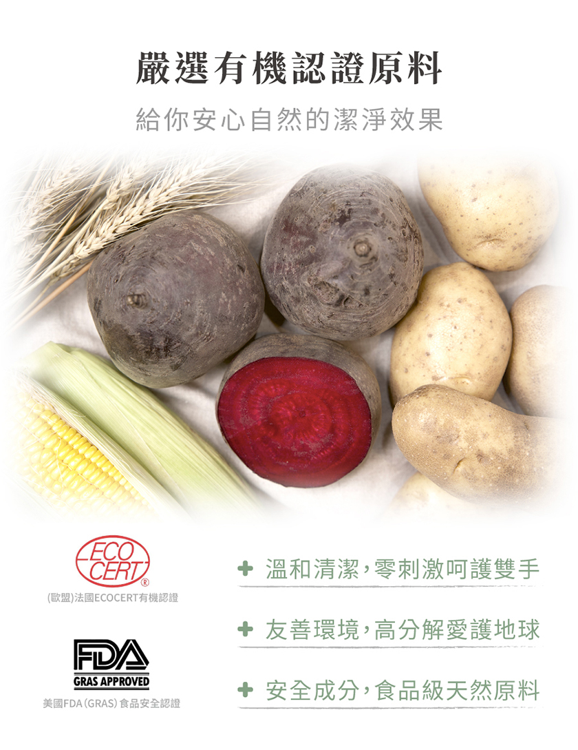 採用天然有機來源的植物性環保潔淨成分,選用(歐盟)法國 ECOCERT與 FDA歐美雙認證 APG綠色有機潔淨因子。