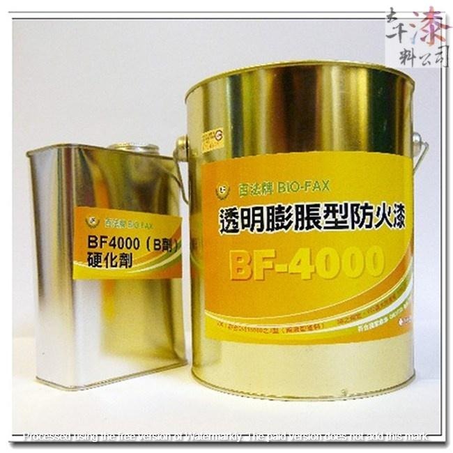 該商品為訂購品,請先付款為您訂購喔,謝謝您。 可開立 耐燃二級 防火證明 坪數 2坪/加侖組 ex:如需10坪防火證明 10÷2=5 需購買5加侖組 方能開立足夠之防火證明 稀釋溶劑:優麗香蕉水 顏色:透明 開立防火證明請提供以下資料 1.施工單位 2.使用單位(某某某工程) 3.地址 木器表面【百法牌BF4000耐燃三級透明防火塗料】(可開立防火證明) 室內專用透明防火塗料。易施工、透明度極佳。 防火漆的防火機理大致可歸納為以下五點: 1. 防火漆本身俱有難燃性或不燃性,使被保護基材不直接與空氣接觸,延遲物體著火和減少燃燒的速度; 2. 防火漆除本身俱有難燃性或不燃性外,它還具有較低的導熱係數,可以延遲火焰溫度向被保護基材的傳遞; 3. 防火漆受熱分解出不燃惰性氣體,沖淡被保護物體受熱分解出的可燃性氣體,使之不易燃燒或燃燒速度減慢。 4. 含氮的防火漆受熱分解出NO、NH3等基團,與有機游離基化合,中斷連鎖反應,降低溫度。 5. 膨脹型防火漆受熱膨脹發泡,形成碳質泡沫隔熱層封閉被保護的物體,延遲熱量與基材的傳遞,阻止物體著火燃燒或因溫度升高而造成的強度下降。 產品特性: • 符合國家標準CNS14705耐燃三級標準。 • 符合建築技術規則建築設計施工篇第八十八條,耐火板、耐燃材料規定。 • 領有「中華民國經濟部標準檢驗局檢驗合格證書」准予銷售使用。 適用範圍 直接作為木器表面,如木柱、門窗、面板、櫥櫃、地板及家具等,所有原木材及貼木皮之木製品,需要透明防火漆處理之處 (不失原有之貌)。 使用方法 • 容量:主劑4000g+硬化劑650g /1加組, 兩液型 (溶劑為香蕉水〉  • 塗佈面積:每平方公尺650公克濕重,2~3道塗佈。 • 乾燥時間:表面乾燥(指觸)約1-2小時。(溫度25℃以上、65%濕度下) • 塗裝間隔:最少3小時最久12小時內。 • 稀釋劑量:不稀釋直接即可使用;香蕉水 —若需要稀釋加香蕉水不得超過10%                            • 塗裝方法:刷塗、滾塗。 每加侖用量面積計算: 7.5 ㎡ ≒ 2.3坪  (約可塗佈 2~3道) 公式【每加侖塗料重量+添加劑+硬化劑) ÷ 單位塗佈量 = 每加侖用量面積】      ( 4000g +200g+ 650g ) ÷ 650 g/㎡ ≒ 7.5 ㎡ ≒ 2.3坪 容    量:主劑4000g+硬化劑650/1加組, 兩液型 (溶劑為優麗香蕉水〉  塗佈面積:每平分公尺650公克濕重,需塗佈2~3道以上。 乾燥時間:表面乾燥(指觸)約1-2小時。(溫度25℃以上、65%濕度下) 塗裝間隔:最少3小時最久12小時。 施工環境:避免10℃以下施工,建議15℃以上。下雨天濕度高,乾燥速度比較慢,        建議雨天盡量不要施工;雨天濕度增加乾燥時間變慢。      **板材含水率超過13%、相對溼度大於85%、溫度低於15℃時,請勿施工。 稀釋劑量:不稀釋直接即可使用,若需要稀釋加優麗香焦水不得超過10% 塗裝方法:刷塗、滾塗。 注意事項 • 避免10℃以下施工 (建議15℃以上) •下雨天濕度高,乾燥速度比較慢,建議雨天盡量不要施工。 • 板材含水率超過13%、相對溼度大於85%、溫度低於15℃時,請勿施工。