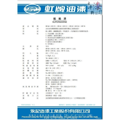 該商品為訂購品,請先付款為您訂購喔,謝謝您。 原廠訂購生產約七個工作天(不含假日、依實際生產流程為準) SP-65 船舶漆 (OF-56) 由長油性醇酸樹脂及耐候性顏料構成之船舶面漆。 產品資訊 用途船上構物、鋼鐵構造物、甲板配件、內部艙房及木器類用面漆。特性外表美觀,保光澤力強。 耐磨性、耐候性優良。 與油性底漆及橡膠性底漆之附著力強。 能耐熱至 80℃(176℉)。 耐海水及耐油性優良。 容易施工。 光澤度有光顏色SP-60(OF-53)#30 SP-61(OF-51)白色 SP-65(OF-56)各色 SP-74 各色