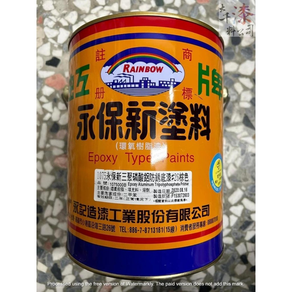 虹牌 1075 永保新三聚磷酸鋁防銹底漆。水線以上部位鋼鐵配件及貯槽、管架、廠房等鋼結構用無公害之優良防銹底漆。