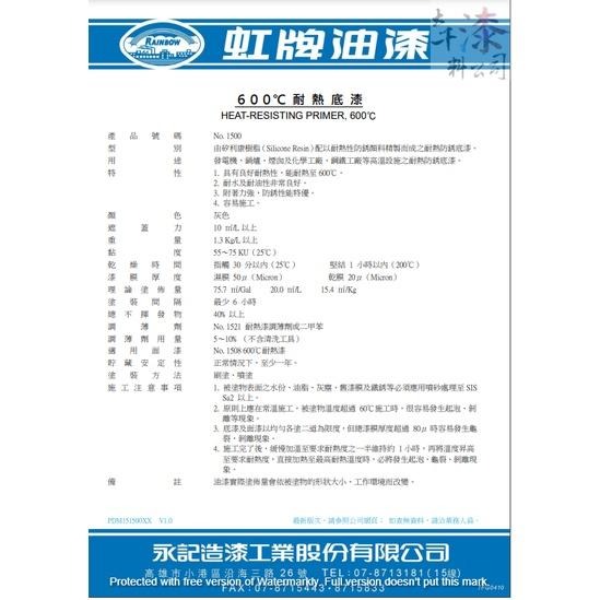 一加侖裝 該產品為訂購品,請先付款幫您訂購喔,謝謝您喔。 1500 600℃耐熱底漆 由矽利康樹脂(Silicone Resin)配以耐熱性防銹顏料精製而成之耐熱防銹底漆。 產品資訊 用途發電機、鍋爐、煙囪及化學工廠、鋼鐵工廠等高溫設施之耐熱防銹底漆。特性具有良好耐熱性,能耐熱至 600℃。 耐水及耐油性非常良好。 附著力強,防銹性能特優。 容易施工。 光澤度-顏色灰色