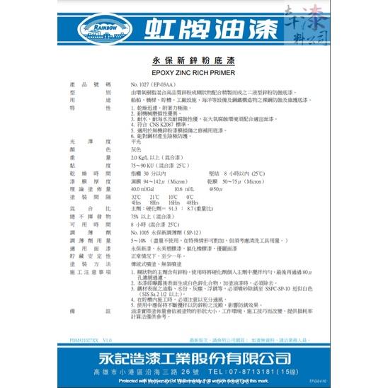 虹牌 永保新鋅粉底漆。鍍鋅漆。防蝕漆。防鏽漆。耐水、耐海水及耐腐蝕性優,在大氣腐蝕環境須配合適宜面漆。