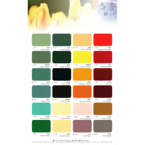 類 型: 由氯化橡膠 (CHLORINATED RUBBER) 樹脂及特殊合成樹脂,配以耐候、耐酸、耐鹼顏料精製而成之橡膠面漆。