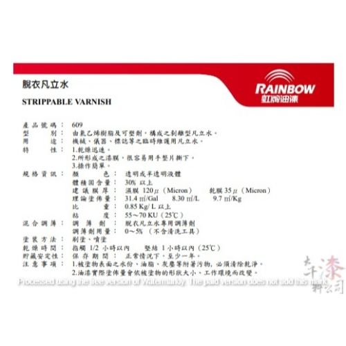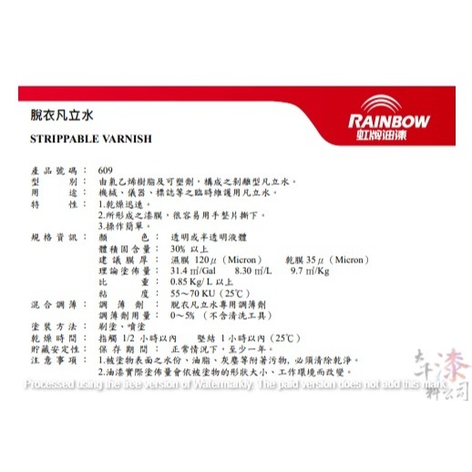 | 用途 | 機械、儀器、標誌等之臨時維護用凡立水。 |