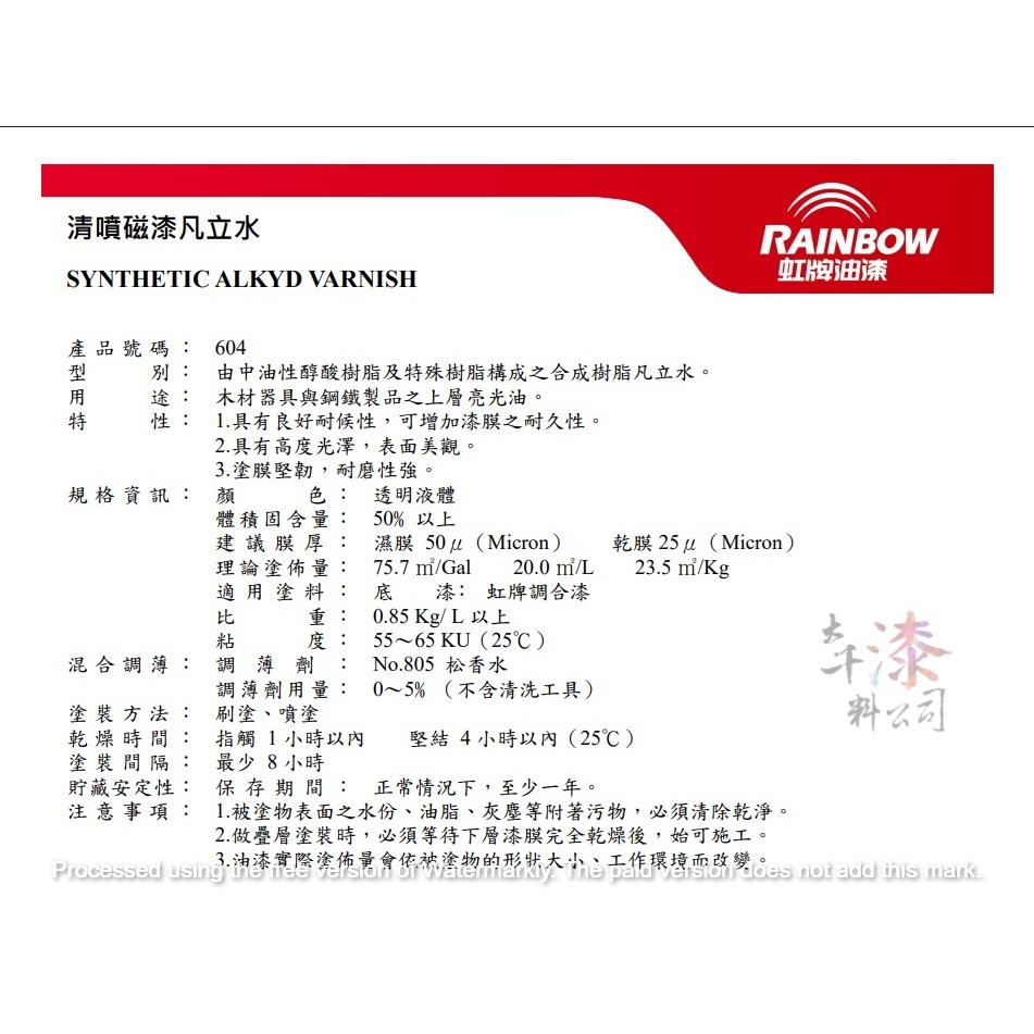 | 用途 | 木材器具與鋼鐵製品之上層亮光油。 |