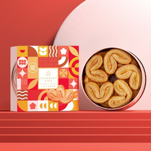 蝴蝶酥是一種流行於歐洲各國的點心,在法國,更是隨處可見的平民美食。香貝里的經典原味蝴蝶酥便是根據法國Pierre Hermé大師的配方加以改良而成,材料雖然簡單,但製作過程卻極為繁瑣。將麵粉、天然奶油和水等材料搓揉而成的生麵團,放入冰箱裡熟成半天,再完整包覆在發酵奶油上。在每次的桿壓,摺疊之後,必須放入冰箱直到麵團徹底地鬆弛,如此重覆6次3折之後才能完成這730層的自製酥皮。細心整型之後再灑上令人誘惑的糖粒,放入250度的烤箱高溫烘烤,讓每一片蝴蝶酥都得到充份的膨脹。歷時三天,才能製作出外層酥脆,內在卻又入口即化的蝴蝶酥喔!