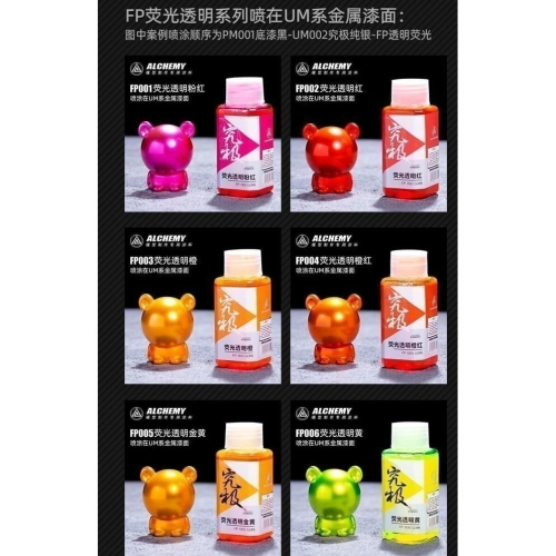 讓大家久等的透明色系列登場了 這一次是二合一雙功能透明究極漆,能在紫外線燈照下發光外,在疊色上也具有一定強悍的效果 特色為 1能在光劍,眼罩、瞄準鏡等…模型透明件上,具備強力的附著力。 2能在紫外光線上發出另人精豔的效果 3發色在金屬件上比一般透明色更為鮮豔 <透明金屬色須上銀色為底色> 究極預調漆免稀釋熒光透明色 <免調漆><簡單上色><超強附著力><超美發色> 紫外線燈照射後會產生發光反映,於圖中 平光中為正常透明色,可以壘在究極銀上作為金屬色