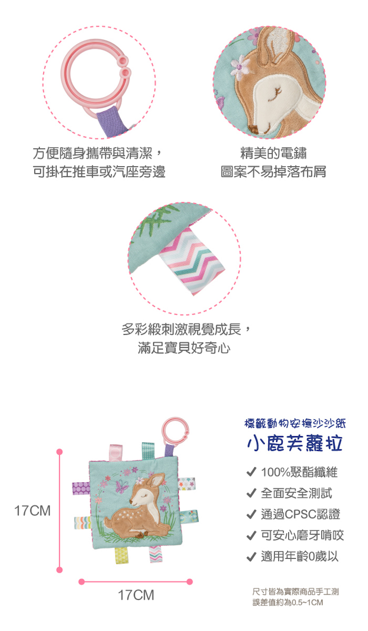 ●商品聲響設計,可刺激寶寶聽覺,亦適合寶寶手指動作練習。