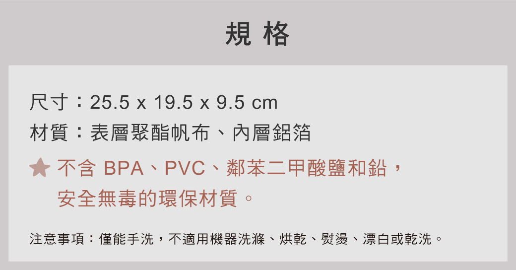 材質: 表層聚酯帆布、內層鋁箔