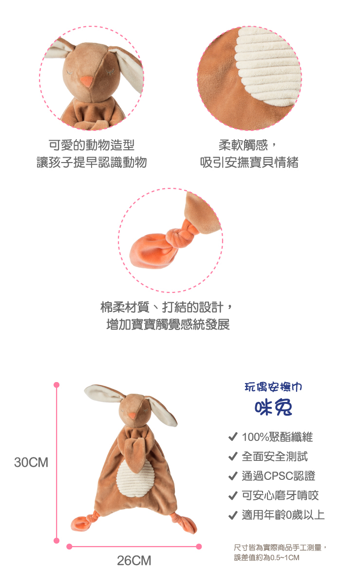 ●打結的角角,刺激寶寶手指發育,有效的安撫寶寶