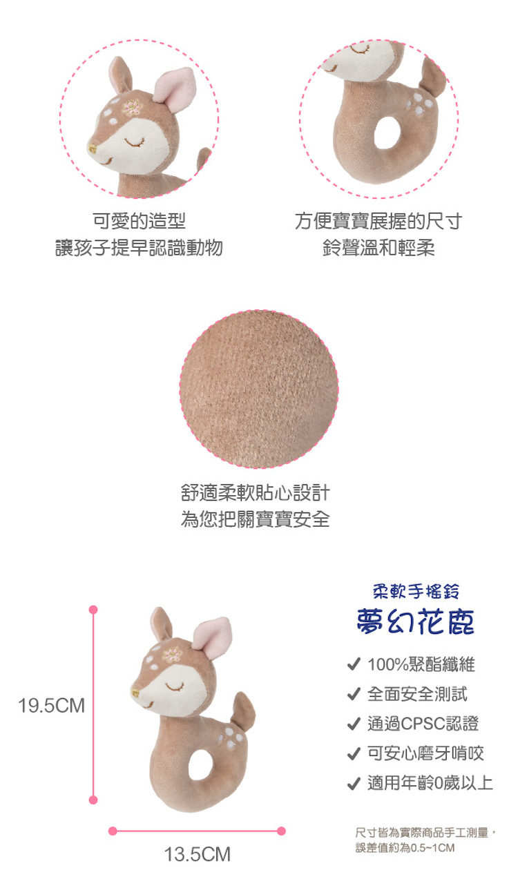 ●手搖鈴聲響設計,可刺激寶寶聽覺,亦適合寶寶手指動作練習。