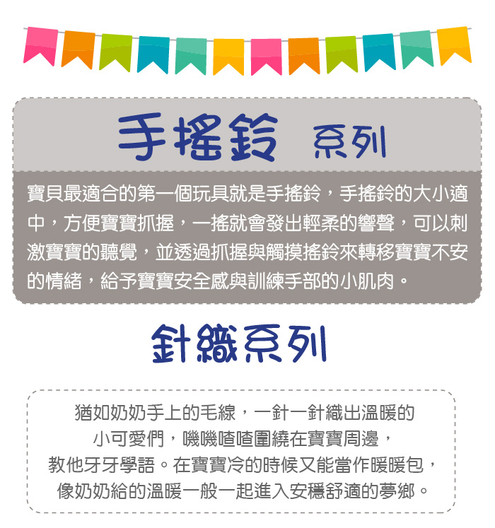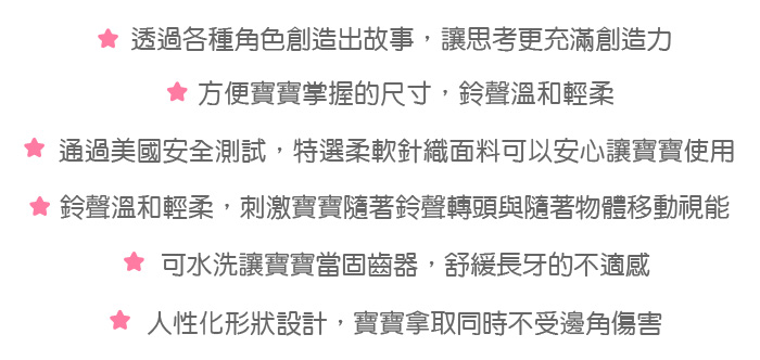 ●商品聲響設計,可刺激寶寶聽覺,亦適合寶寶手指動作練習。
