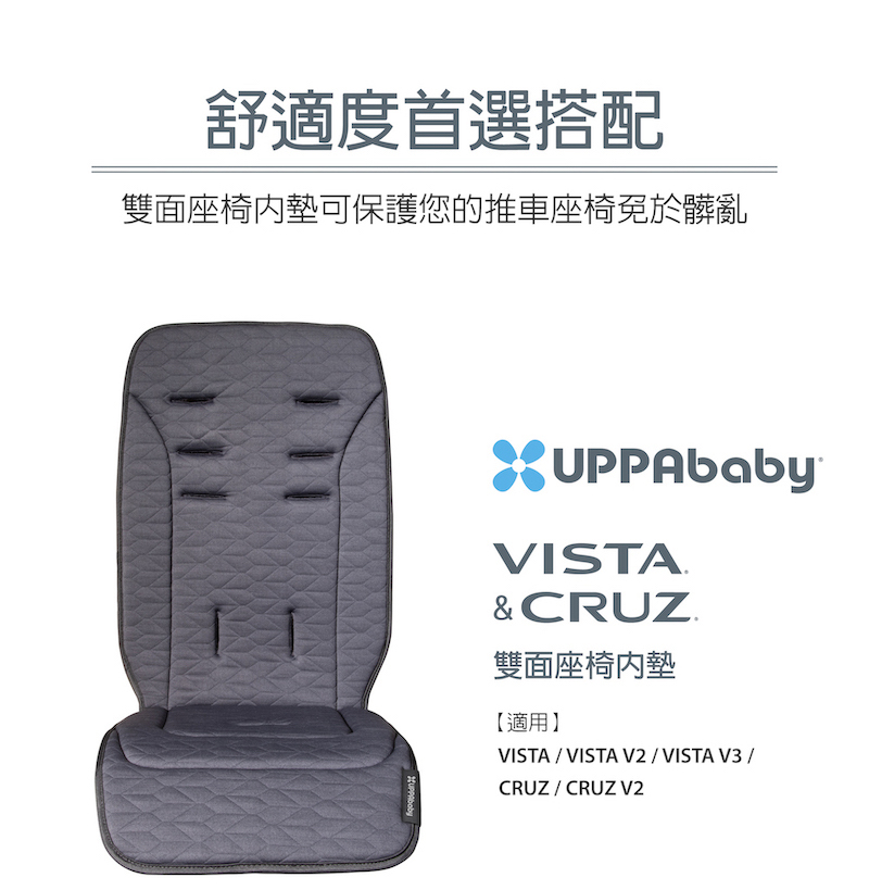 特點:雙面座椅內墊可保護您的推車座椅免於髒亂。一面防水材質,另一面是舒適的綿料材質,適合涼爽的天氣。可機洗。適合所有VISTA和CRUZ及V2車款。