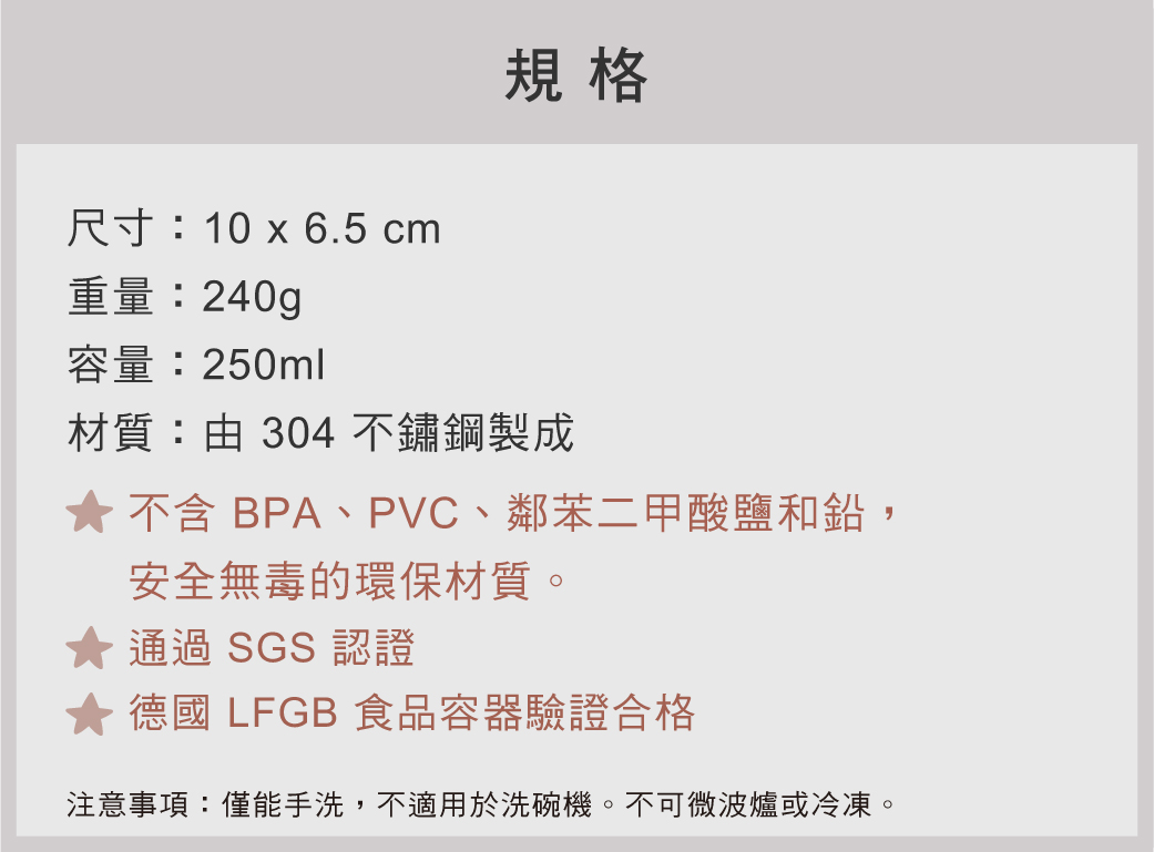 材質:由 304 不鏽鋼製成,不含 BPA 和鄰苯二甲酸鹽