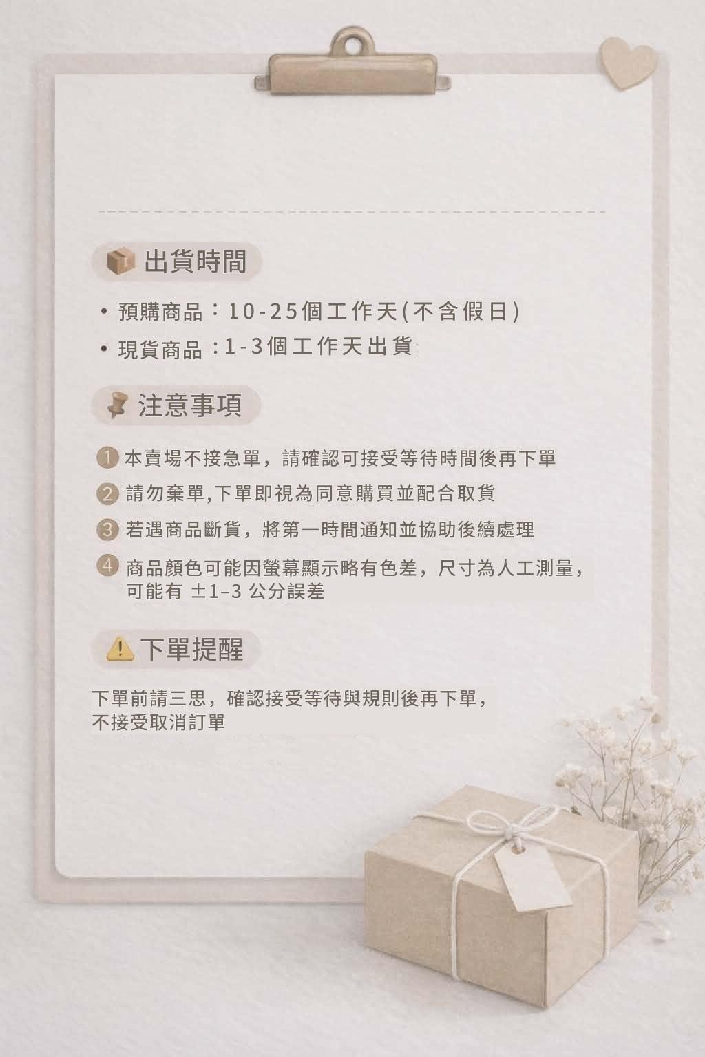 <p style="text-align:center;margin-bottom:0px;vertical-align:baseline;background-size:initial;color:rgb(51,51,51);line-height:inherit;font-family:'微軟正黑體';"><span style="font-size:1rem;vertical-align:baseline;background:transparent;letter-spacing:0.15px;">📦</span><span style="vertical-align:baseline;background:rgb(255,255,0);">出貨時間</span></p><p style="margin-bottom:0px;text-align:center;vertical-align:baseline;background-size:initial;color:rgb(51,51,51);line-height:inherit;font-family:'微軟正黑體';"><span style="font-size:1rem;vertical-align:baseline;background:transparent;color:rgb(8,8,9);font-family:'Segoe UI Historic', 'Segoe UI', Helvetica, Arial, sans-serif;"> ・</span>預購商品:10-25天(不含假日)</p><p style="margin-bottom:0px;vertical-align:baseline;background-size:initial;color:rgb(51,51,51);line-height:inherit;font-family:'微軟正黑體';"></p><div style="vertical-align:baseline;background-size:initial;text-align:center;"><div style="color:rgb(51,51,51);font-family:'微軟正黑體';"><span style="background:transparent;font-size:1rem;vertical-align:baseline;color:rgb(8,8,9);font-family:'Segoe UI Historic', 'Segoe UI', Helvetica, Arial, sans-serif;">・</span><span style="font-size:1rem;">現貨商品:1-3天內出貨</span></div><div><font color="#333333" face="微軟正黑體"><br /></font></div><span style="font-family:'微軟正黑體';vertical-align:baseline;background-size:initial;letter-spacing:0.15px;"></span><div><span style="letter-spacing:0.15px;font-size:1rem;background-color:rgb(255,255,0);"><font color="#000000">📌注意事項</font></span></div><div><span style="letter-spacing:0.15px;color:rgb(51,51,51);font-family:'微軟正黑體';"> 1️⃣ 本賣場不接急單,請確認可接受等待時間後再下單</span></div></div><div style="text-align:center;vertical-align:baseline;background-size:initial;color:rgb(51,51,51);font-family:'微軟正黑體';letter-spacing:0.15px;"><div style="vertical-align:baseline;background-size:initial;letter-spacing:0.15px;"><span style="letter-spacing:0.15px;"> 2️⃣ 請勿棄單,下單即視為同意購買並配合取貨</span></div><div style="vertical-align:baseline;background-size:initial;letter-spacing:0.15px;"><span style="letter-spacing:0.15px;"> 3️⃣ 若遇商品斷貨,將第一時間通知並協助後續處理</span></div><div style="vertical-align:baseline;background-size:initial;letter-spacing:0.15px;"> 4️⃣ 商品顏色可能因螢幕顯示略有色差,尺寸為人工測量,可能有 ±1–3 公分誤差</div></div><div style="vertical-align:baseline;background-size:initial;text-align:center;"><div style="vertical-align:baseline;background-size:initial;"><div style="background-size:initial;vertical-align:baseline;text-align:justify;"><div style="background-size:initial;vertical-align:baseline;text-align:left;"><span style="background-size:initial;vertical-align:baseline;"></span><p style="margin-left:50px;background-size:initial;vertical-align:baseline;text-align:center;"><span style="background-size:initial;vertical-align:baseline;"></span></p><div style="text-align:center;background-color:transparent;"><font color="#333333" face="微軟正黑體"><span style="letter-spacing:0.15px;"><br /></span></font></div><span style="background-size:initial;vertical-align:baseline;"></span><div style="text-align:center;"><font color="#000000" style="background-color:rgb(255,255,0);">⚠️下單提醒</font></div><div style="text-align:center;font-family:'微軟正黑體';font-size:1rem;letter-spacing:0.15px;color:rgb(51,51,51);"><span style="background-color:transparent;font-size:1rem;letter-spacing:0.15px;">下單前請三思,確認接受等待與規則後再下單,不接受取消訂單</span></div></div></div></div></div>