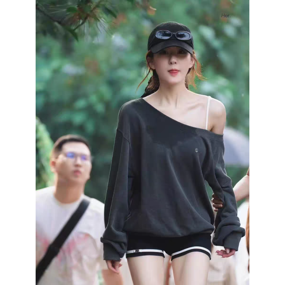 灰色斜肩衛衣+撞色吊帶+短褲三件組