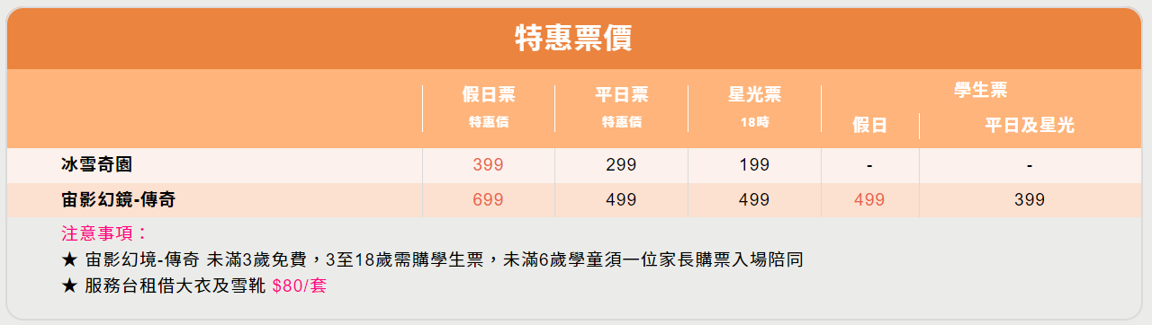 2.冰雪奇園入場須穿著大衣及雪靴(服務台及售票櫃檯皆可租借,每套80元)。