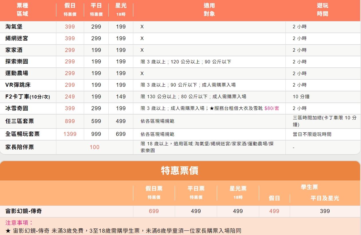 使用以上五區,大人陪同票現場購買100元即可(以現場牌告價為主)