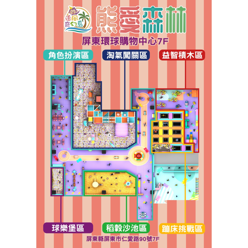 1、本券可1大1小全區全日𣈱玩屏東環球購物中心7F 追風奇幻島 【熊愛森林】(六歲以下需全程陪同一位大人入場)