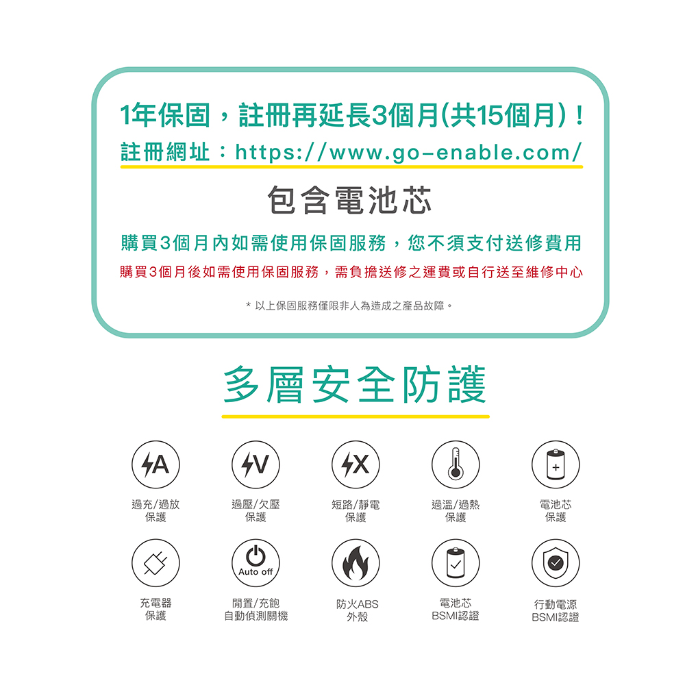 ◎產品保固:行動電源主體 1年 (完成註冊延長至15個月)、充電線 3個月 ◎產地:台灣製造 【