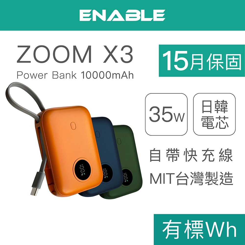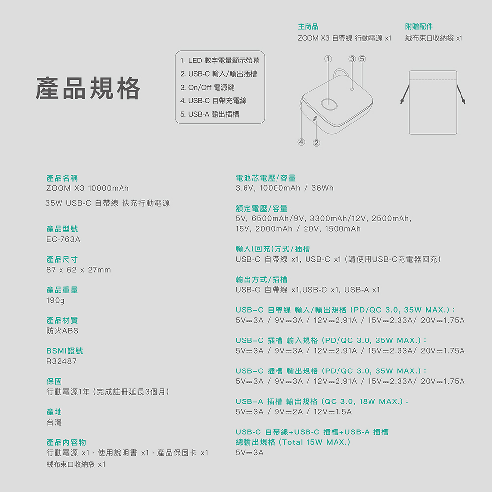 ◎產品名稱: ZOOM X3 10000mAh 35W PD 3.0 & QC 3.0 自帶線雙向快充行動電源