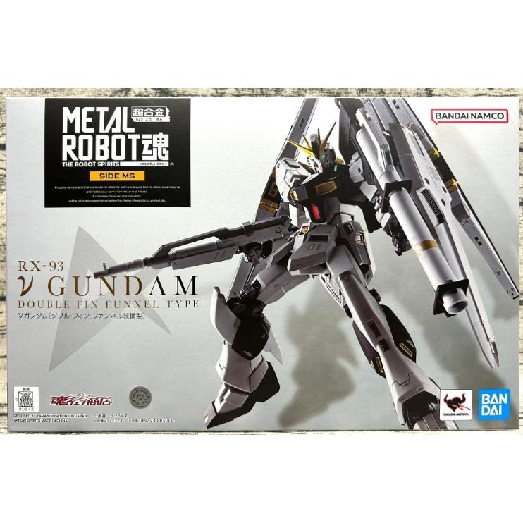 「METAL ROBOT魂 RX-93 ν鋼彈(雙翼狀感應砲裝備型)」全高約 15 公分,造型忠實再現當時設定稿中特色的肩甲、胸甲、光束步槍、盾牌等造型,全機施以極具厚重質感的消光色、金屬色塗裝,並在各處印製豐富的機身標誌帶來高密度的細節。而身體與四肢的主要關節也使用經過電鍍加工的合金零件製作,具備牢固、靈活的可動性,包含肩部拉出式關節、膝部與腳掌的可動關節,把玩起來更具躍動感。 武裝部分包含光束步槍、盾牌、光束軍刀、具備伸縮機構的 ν 超絕火箭炮,以及背包兩側上下顛倒裝設的翼狀感應砲,配件附有專用台座以及一組透明支架,能夠將 6 枚翼狀感應砲拆下裝設,再現感應砲飛出展開射擊的戰鬥場景。