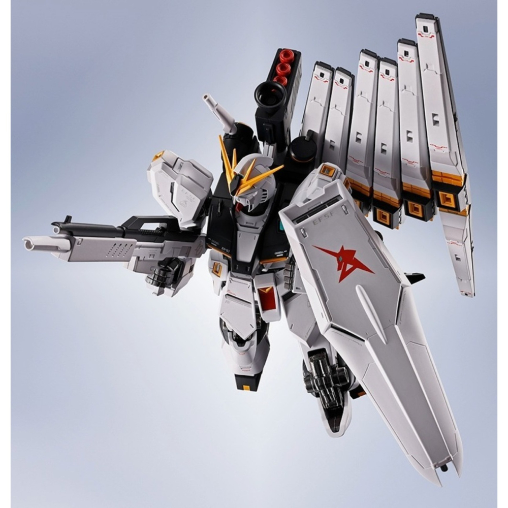 商品內容: ・本體 ・替換用手掌左右各3種 ・翼狀感應砲×6 ・光束步槍 ・光束軍刀刃 ・ν超絕火箭炮 ・對盾牌 ・台座連接零件 ・專用台座一組 ・翼狀感應砲用連接零件一組