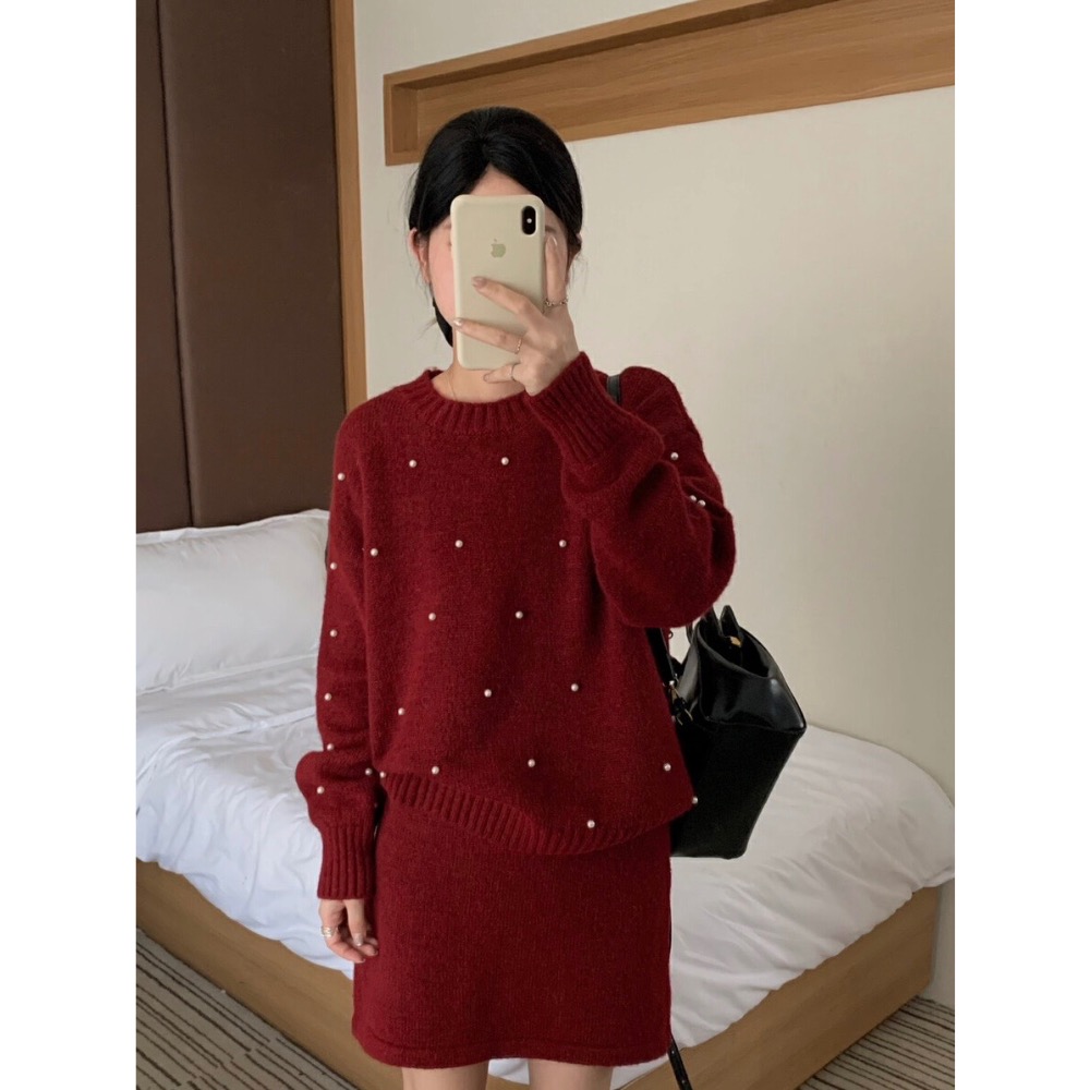 千金高級感針織滿版珍珠釘珠毛衣套裝毛衣+氣質高腰顯瘦短裙經典小香黑酒紅2色