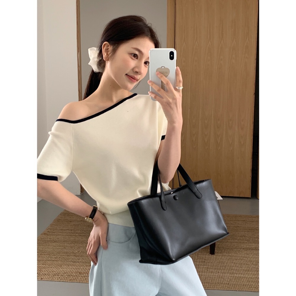 台中現貨 氣質lady風 小露香肩 小香撞色 不對稱拼色斜領側扣短袖針織衫